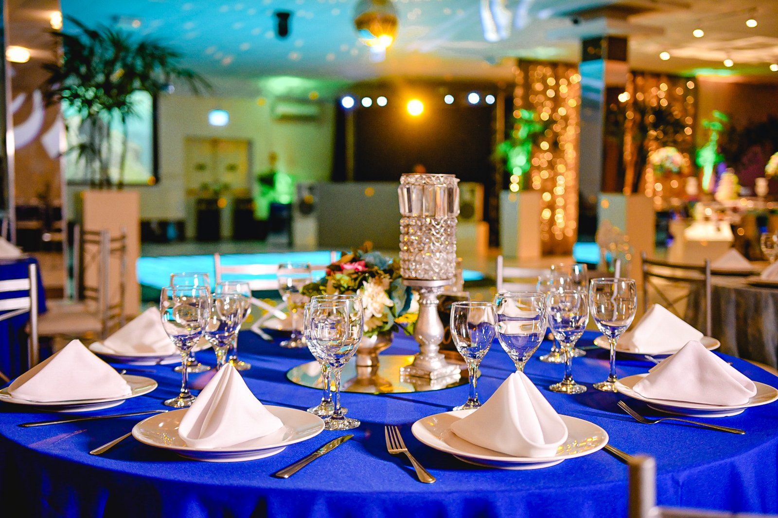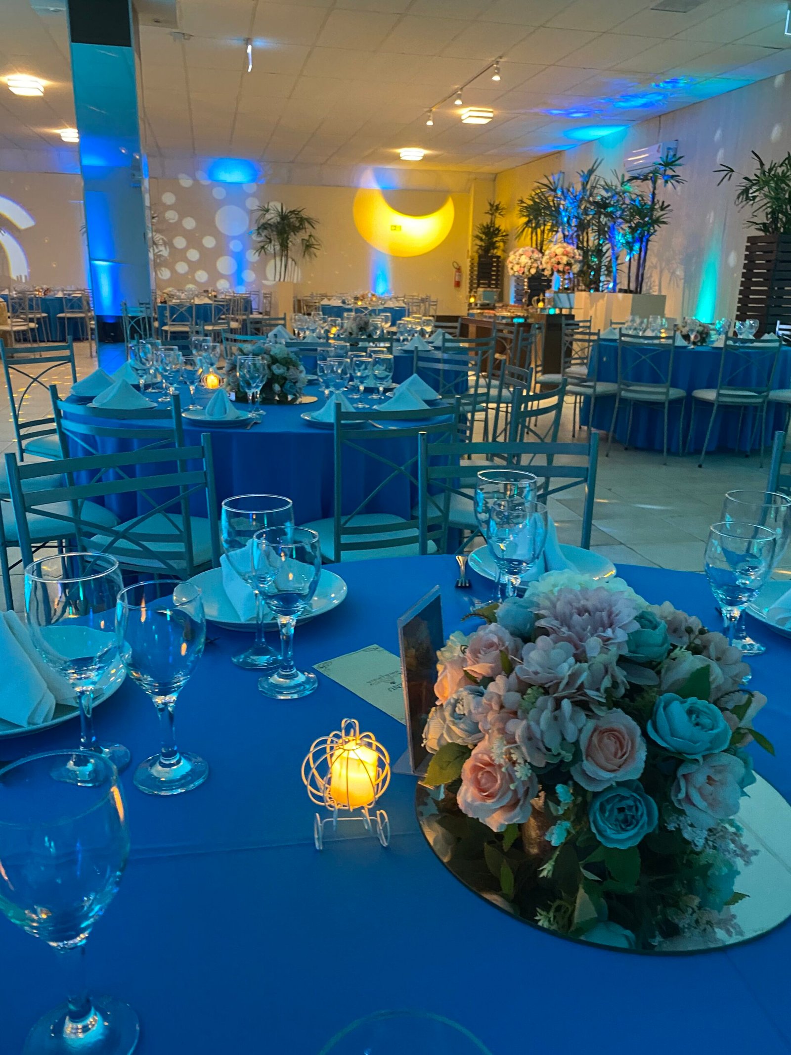 Mesas, cadeiras, toalhas e elementos decorativos básicos.